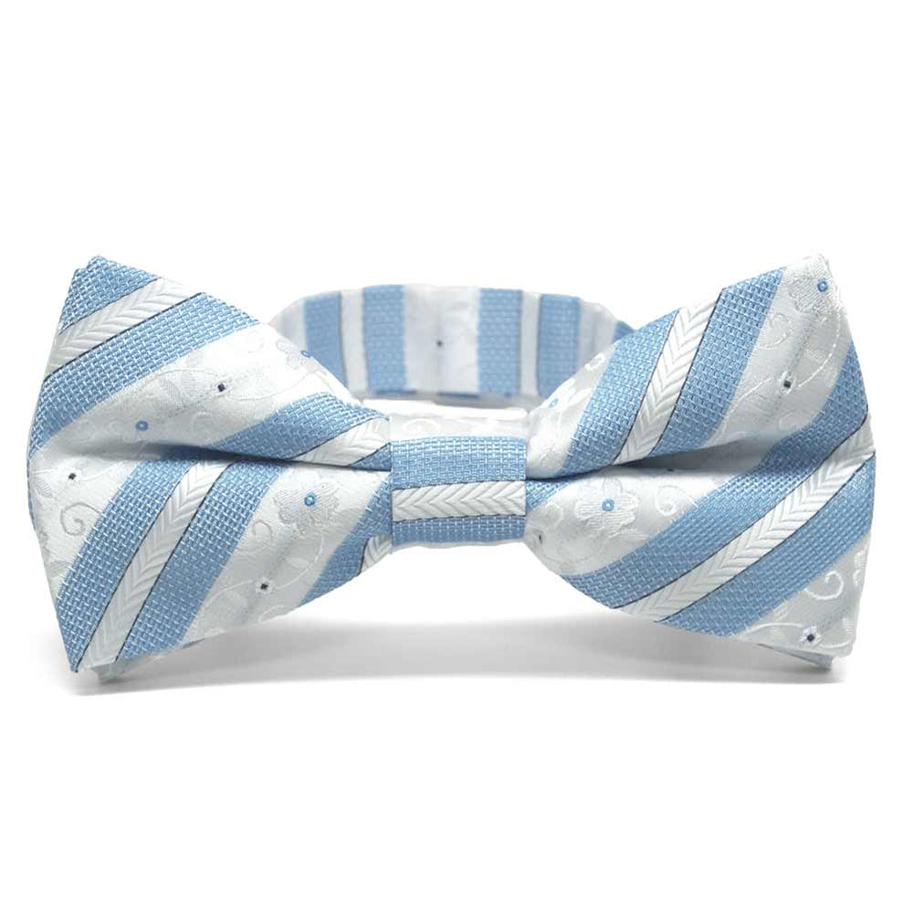 Exclusively ours! This sky blue floral striped bow tie is the perfect addition to your fresh spring wardrobe. With its pre-tied design, it’s easy to wear while offering a vibrant mix of floral vine and textured stripe patterns. The adjustable band collar ensures a comfortable fit for most adult neck sizes. Complete your spring look with this pattern, also available in a self-tie bow tie and coordinating pocket square.