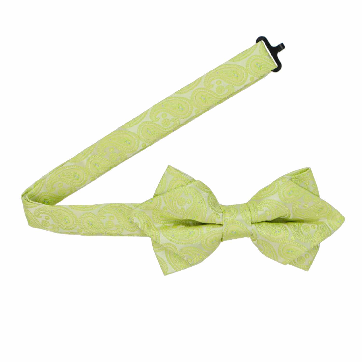 Embrace the season with this vibrant, apple green paisley diamond tip bow tie, offering a refreshing burst of color to enhance any outfit. Whether you’re uniting groomsmen with bridesmaids, complementing your Prom date, or adding a dash of personality to your office attire, this bow tie is up to the task. Available in boys' sizes, it's an excellent choice for creating a coordinated family look for photos. Combine it with your favorite suit to effortlessly brighten up your wardrobe with a touch of springtime flair!