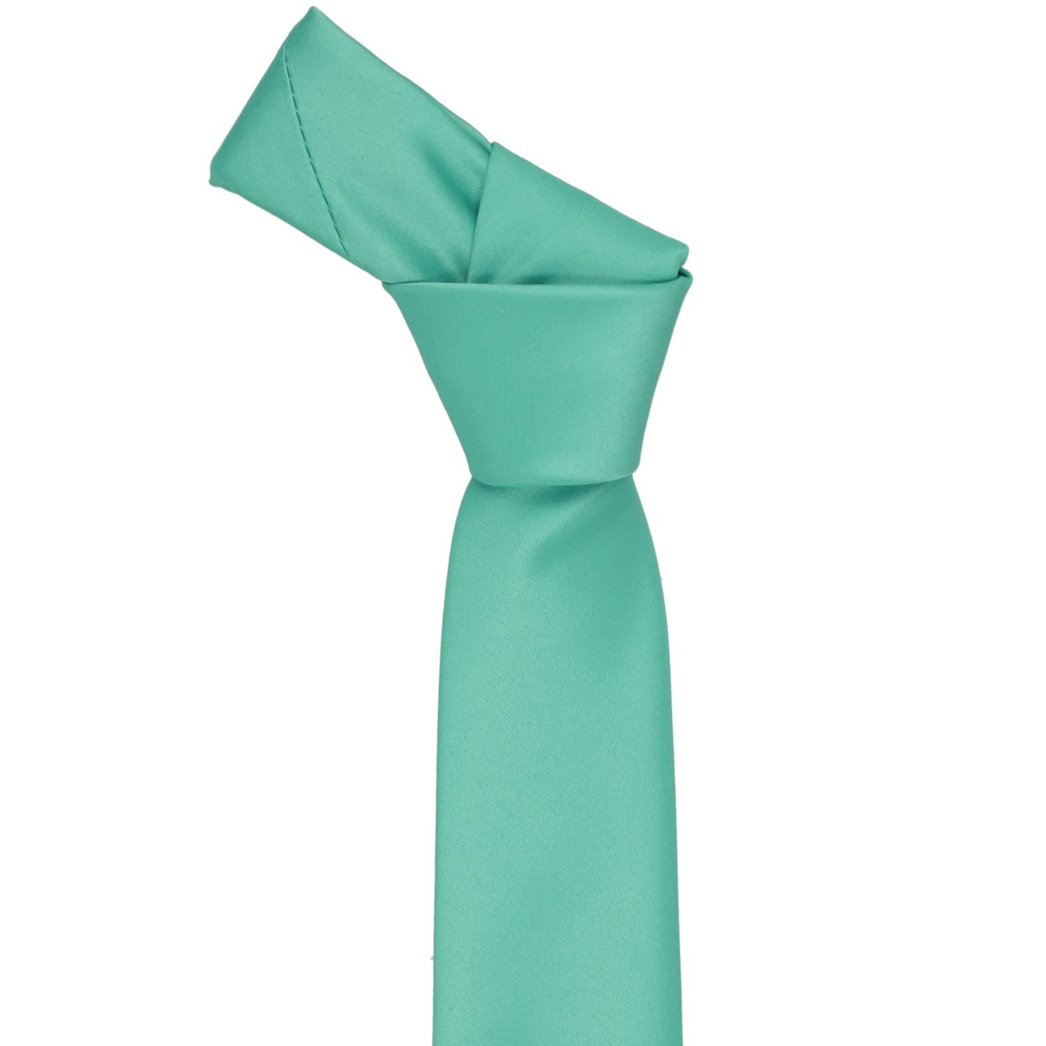 This aquamarine slim necktie provides a subtly trendy look without going too skinny. The approximate 2.5-inch width measures 0.5-inches wider than today's ultra-trendy skinny ties, but about 1-inch skinnier than a traditional men's tie. The in-between width makes it a popular necktie for fashionably outfitting a large group of different sized adults or teens.