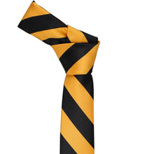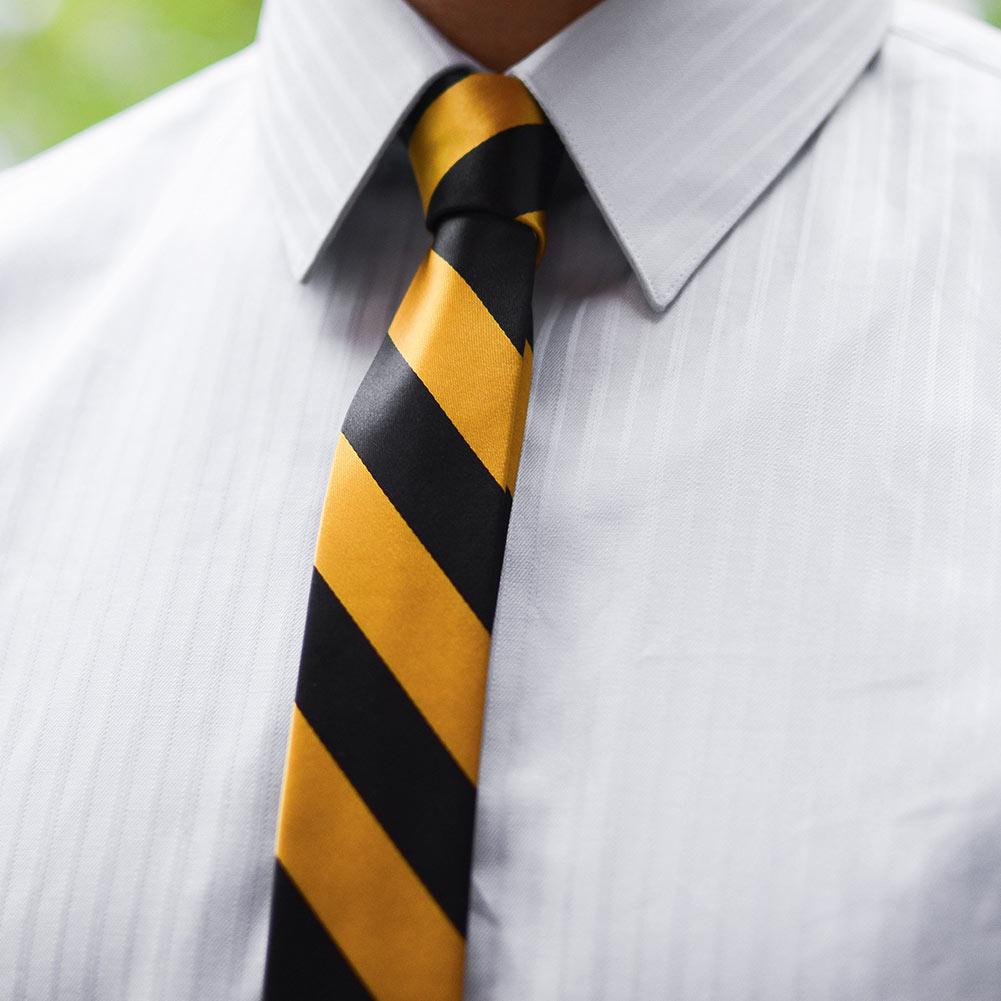 Our most popular striped ties are now available in a trendy, 2-inch width. This skinny black and gold bar striped tie is made from heavyweight woven material with a smooth, satin finish.