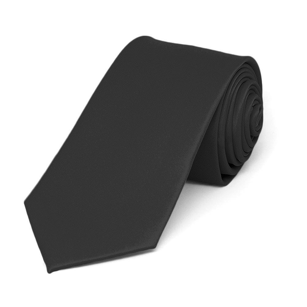 This black slim tie is the perfect mix of trendy and modern. It measures 2.5-inches wide. While it's not our skinniest tie, it's still about 0.75 to 1-inch thinner than a traditional tie. This is a popular size for young professionals and since it's solid black it can be worn for formal occasions, as well.