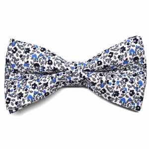 A mini floral vine pattern in shades of blue adorns this white bow tie. Perfect for a romantic wedding vibe or rustic-themed attire. It makes a great addition to a navy blue suit or shirt and slacks combo. Try adding it to a pair of our dark navy blue skinny suspenders for a modern look.