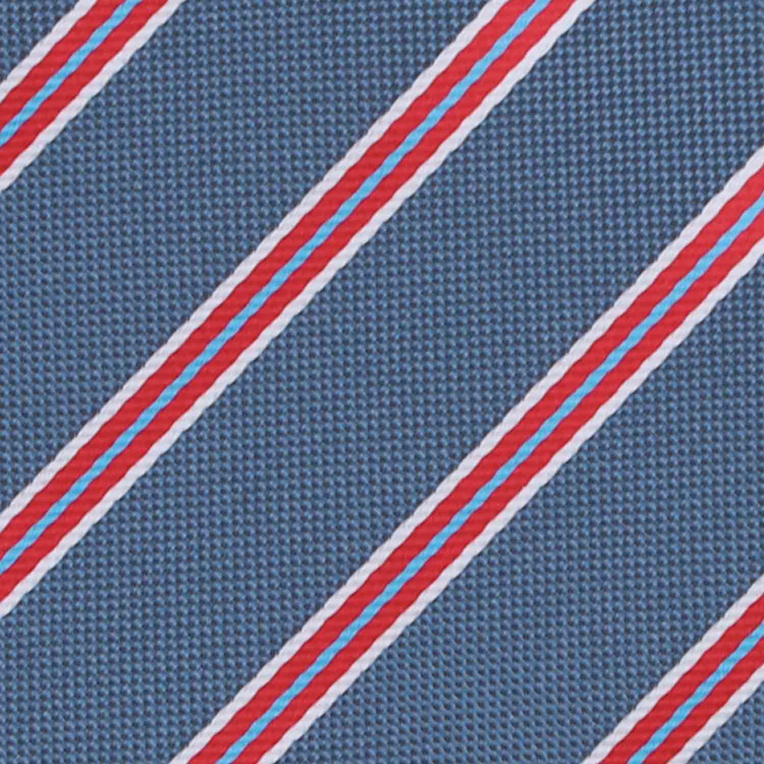Denim blue, red and white pencil striped zipper tie, folded front view