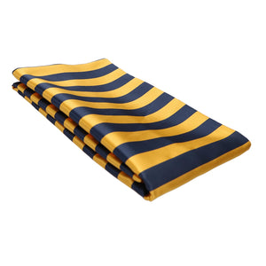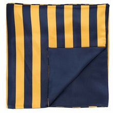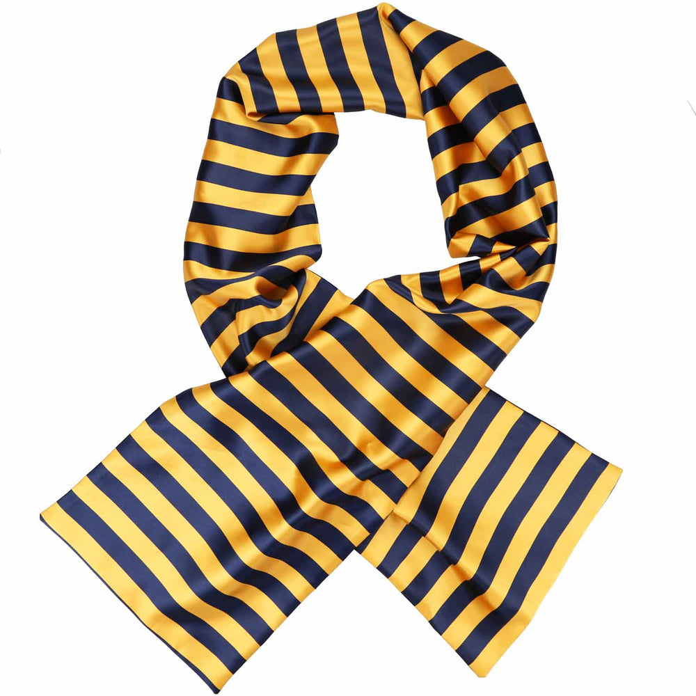 Our scarves have gone collegiate with this navy blue and gold number. It's made from the same material as our men's striped ties, allowing you to easily coordinate a professional matching group look for school or corporate settings. This is a longer length scarf, so it can be worn a number of ways, including a front knot or tuck, tied into a bow, secured with a scarf ring (not included) or simply draped around the shoulders.