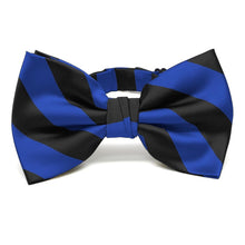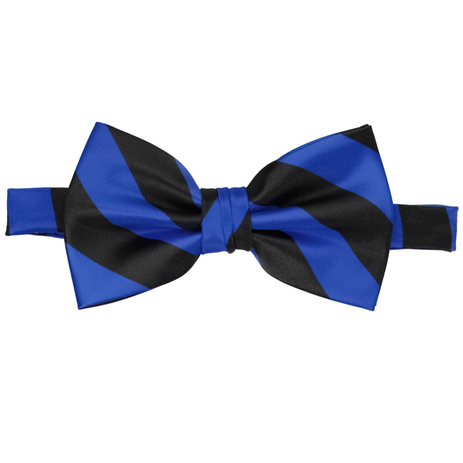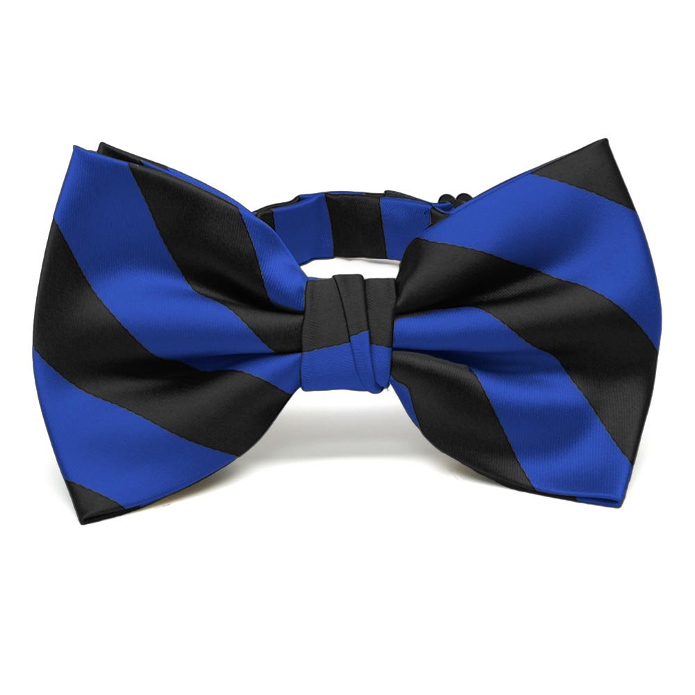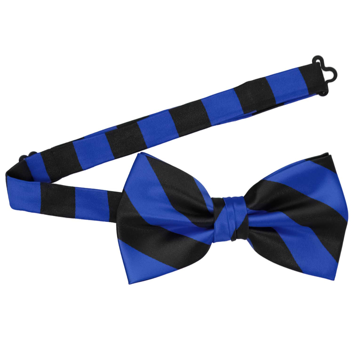 This royal blue and black striped bow tie features a pre-tied, band collar that expands to fit neck sizes up to 19-inches. Made from all polyester microfiber, it is designed to match our bestselling men's royal blue and black striped tie. Matching pocket squares are available for purchase.