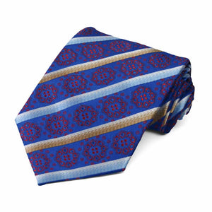 A unique medallion pattern complements the stripes of this blue and burgundy geometric necktie. Picking an outfit in the morning is easy with this versatile tie and pocket square set. Pair it with a navy blue, tan, or brown suit and the included matching pocket square for a finishing touch.