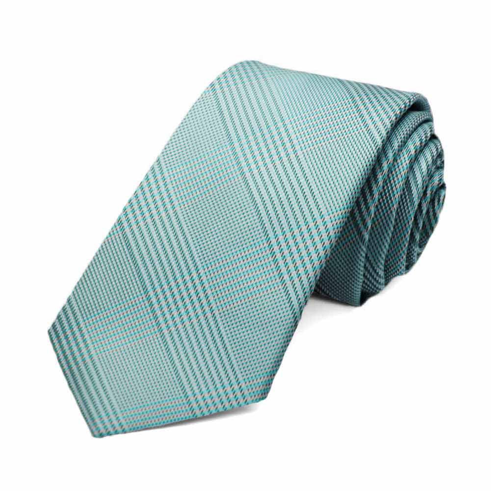 A special purchase slim tie and pocket square set, available while supplies last. This men's slim necktie features a woven glen plaid pattern in turquoise. A matching pocket square is included. More patterns available at this incredible price.