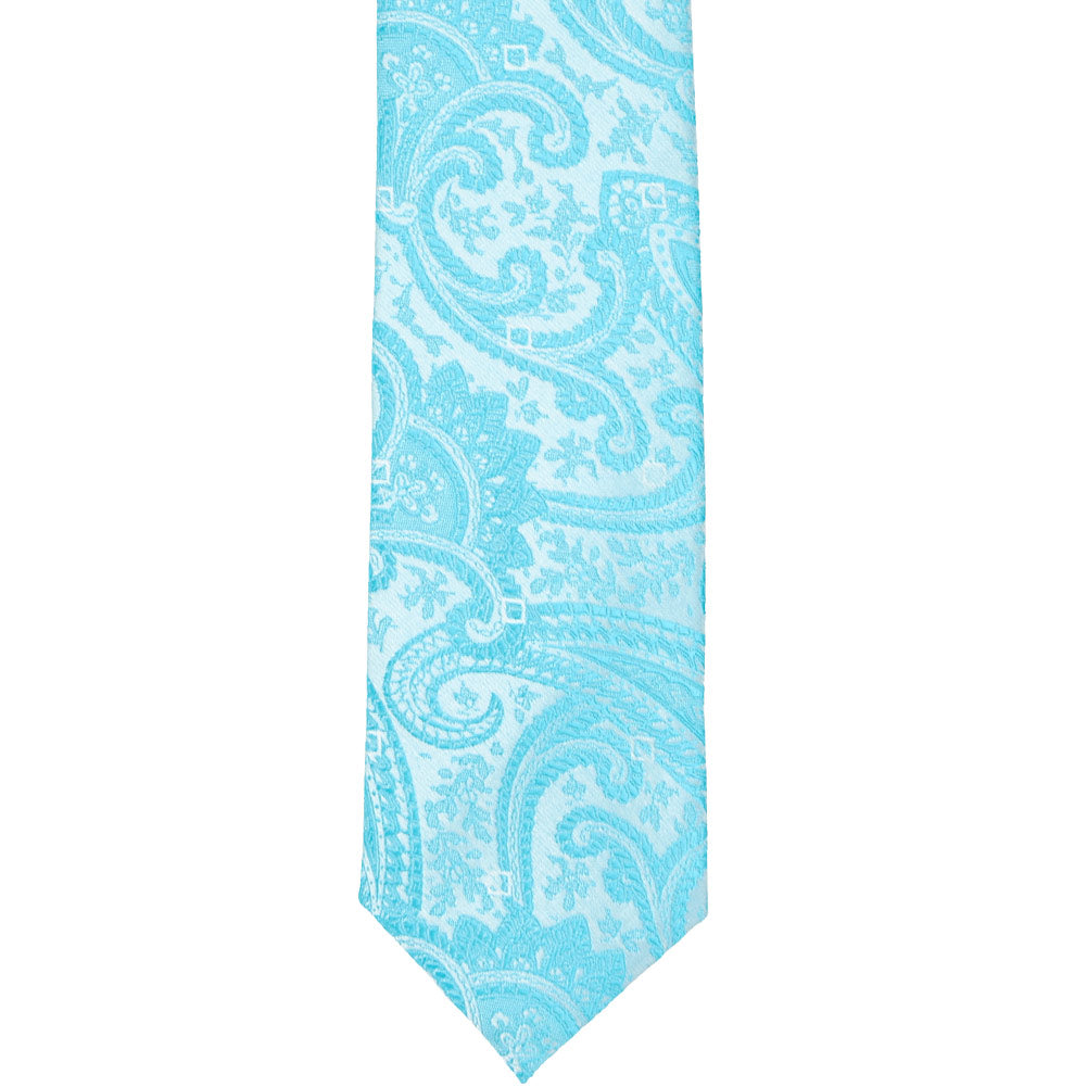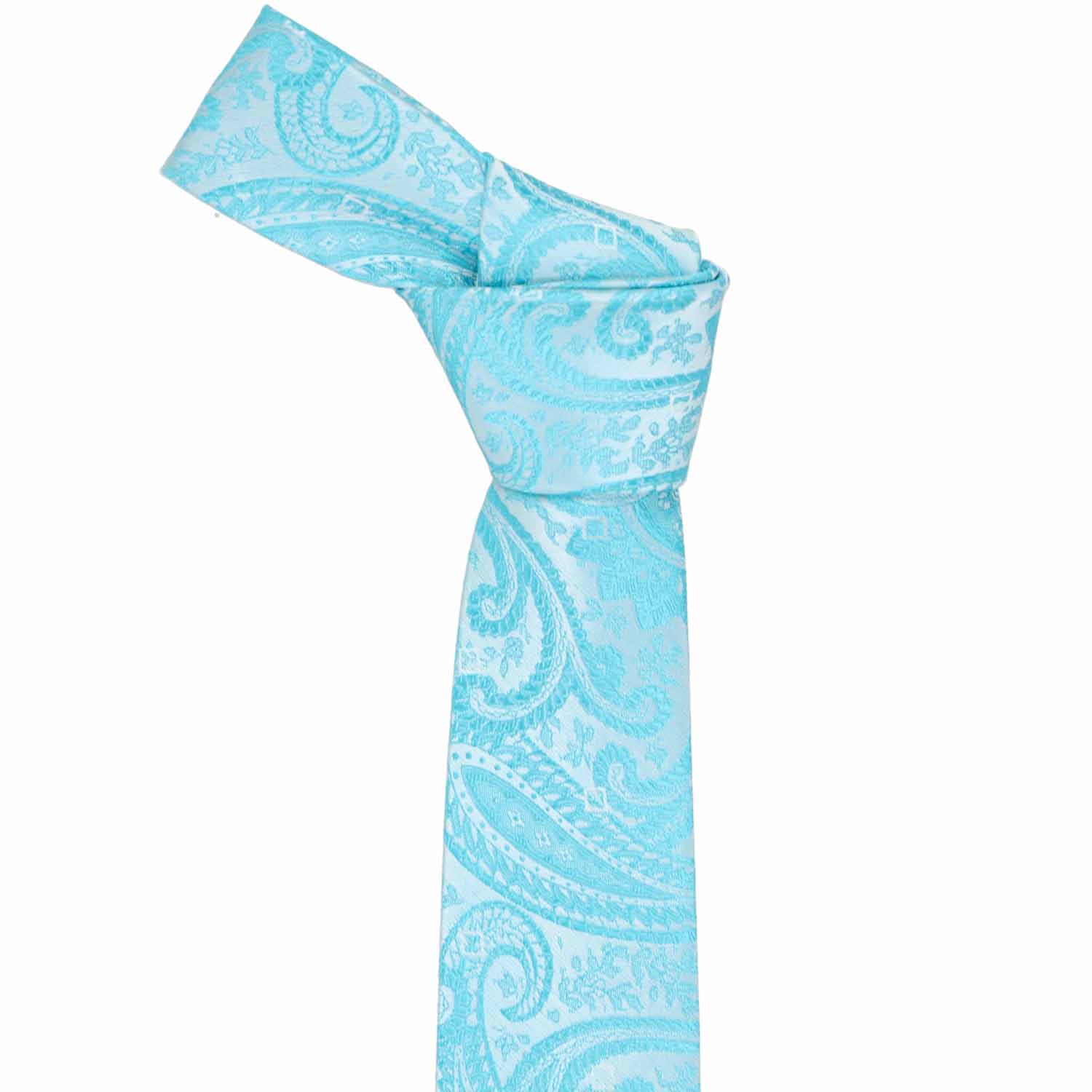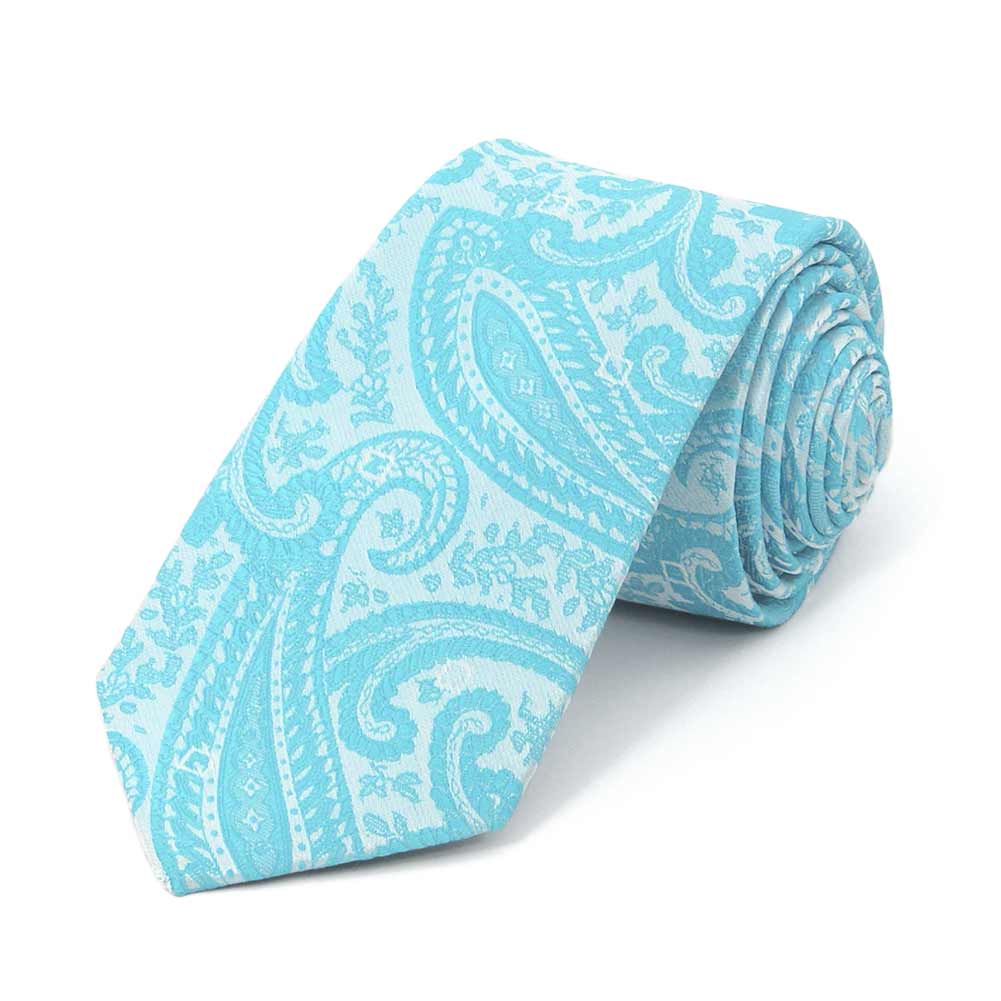 Turquoise paisley slim necktie, rolled to show pattern up close
