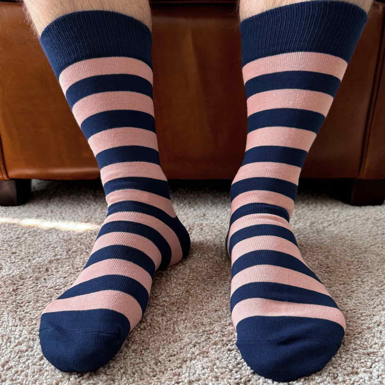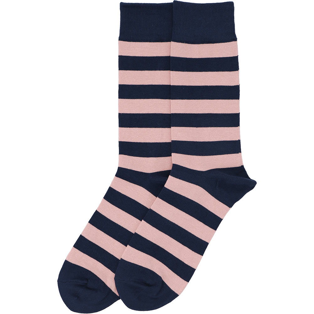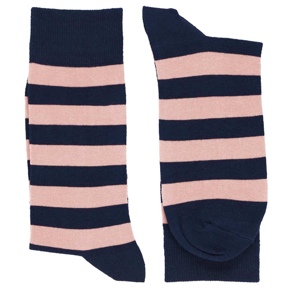 Oh my blush! These blush pink and navy blue striped socks are the finishing touch for your groomsmen. The stripes will not only match your wedding colors, but they will look sharp with any suit color—navy, gray, tan, etc.