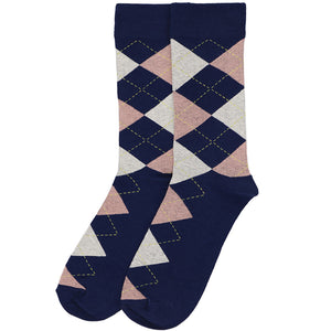 Congrats! These men's navy blue and blush pink argyle socks are our most popular wedding socks. This pattern features a navy blue, blush pink and gray design with very subtle yellow piping. These timeless socks look fantastic with navy blue or gray groomsmen suits.
