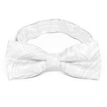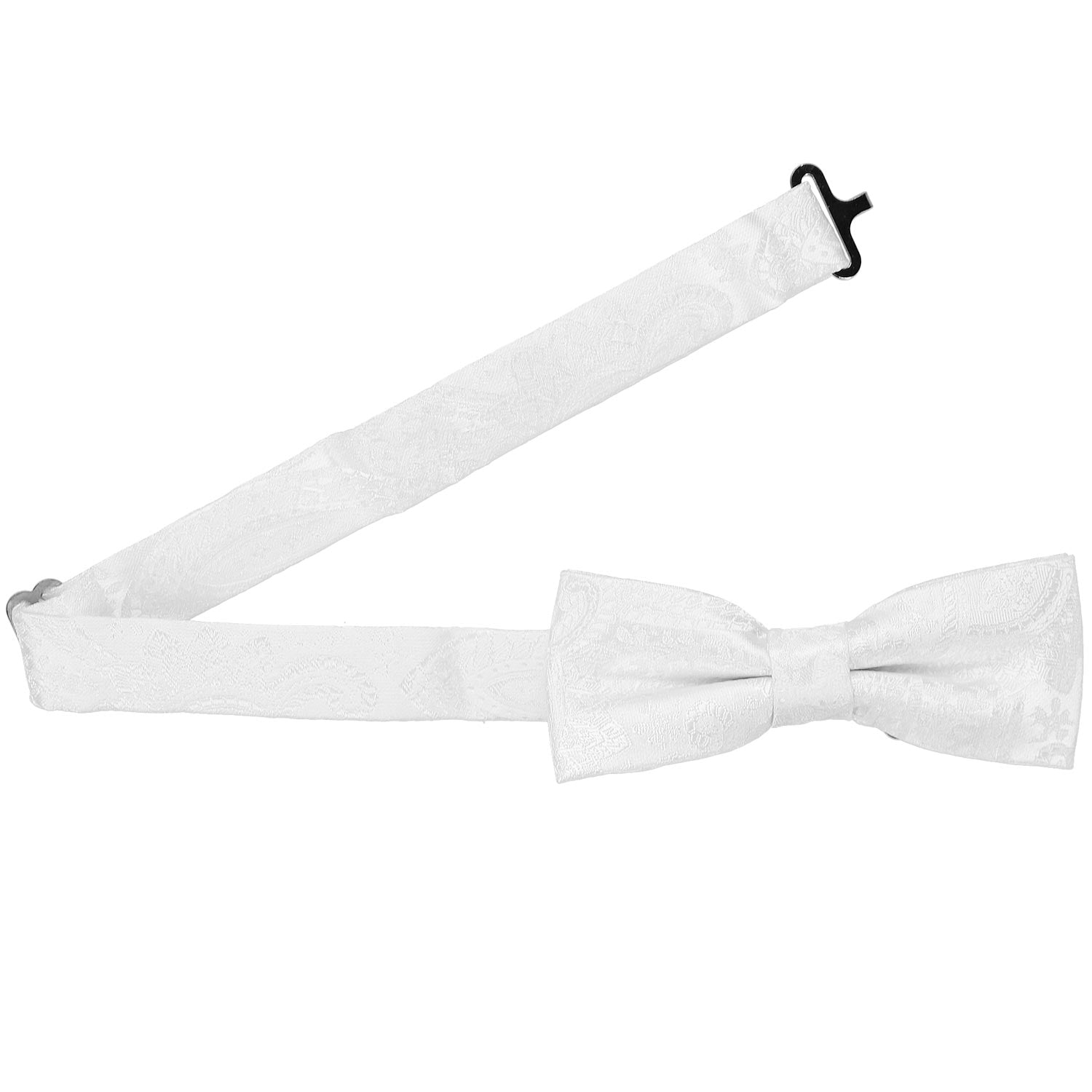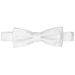 If wedding bells are in your future, this white paisley boys' bow tie is ready to shine! Its timeless elegance and subtle tone-on-tone pattern make it the perfect accessory for your ring bearer. Whether paired with a sleek navy suit or a classic black tuxedo, it effortlessly complements a variety of looks. A wedding favorite, this bow tie is a elegant choice that will never go out of style.