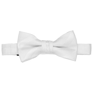 This formalwear-ready boys' white striped bow tie will look stunning on your ring bearer, or for any other dressed up occasion. The alternating satin and ribbed stripes create a tone-on-tone look that elevates this bow tie beyond a solid white bow tie, but is still just as easy to match. Outfitting a wedding party or coordinating a father/son look is easy with this bow tie. Our elite stripe collection is also available in men's neckties, bow ties and pocket squares.