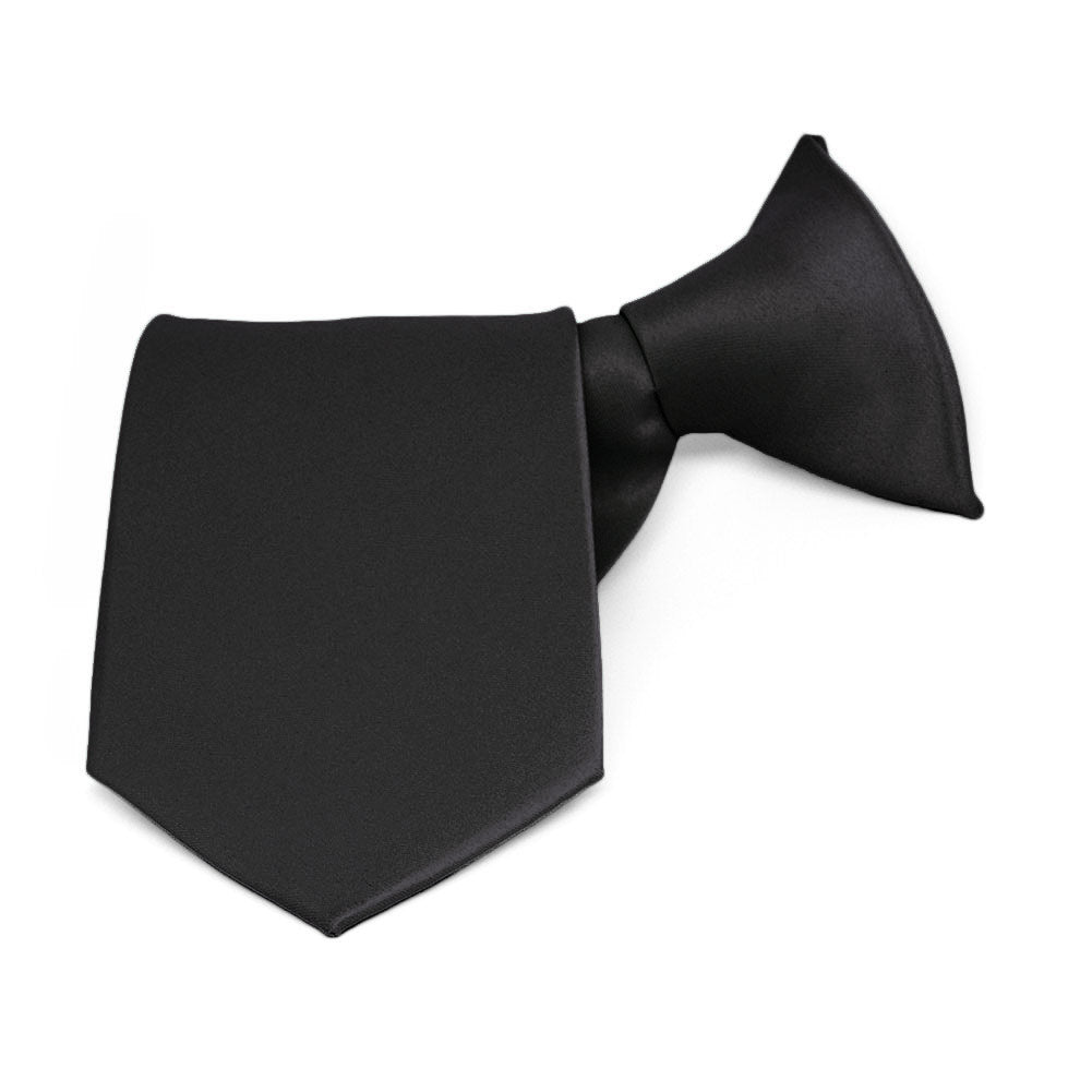 These boys' black clip-on ties are easy to use and sized just right for your little guy. Available in an 8-inch, 11-inch or 14-inch length, these pre-tied ties fit most boys up to 10-years old. The tie clip simply attaches to the top of the boy's shirt, without any material around the child's neck. Made from durable, 100% polyester with a satin finish. Matching adult sizes are available for purchase.