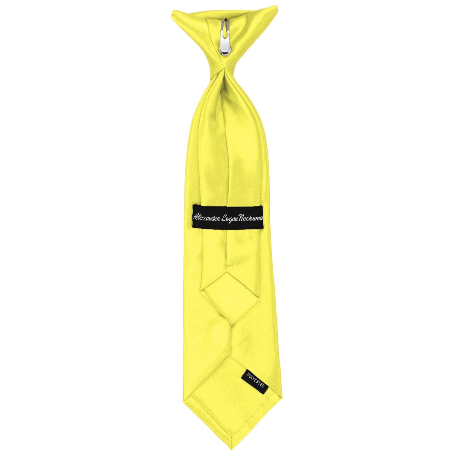 This boys' daffodil yellow clip-on tie has a softer feel and slightly shinier satin finish when compared to our other clip-on ties. It is easy to use and sized just right for your little guy. Available in an 8-inch, 11-inch or 14-inch length, these pre-tied ties are sized to fit most boys up to 10-years old. The clip on the tie simply attaches to the top of the boy's shirt, without any material around the neck. This boys' clip-on tie is designed to match our signature collection of men's daffodil yellow solid color neckties.