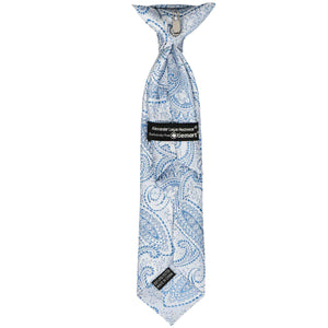 Clip and go! You'll both appreciate the ease of this pre-tied tie. It arrives already knotted so it simply clips to the top of his shirt collar-without any material around the neck. We get into sizing details below, but there are three sizes available to fit children up to about 10. (Each features a traditional width.) Made from durable polyester with a stylish textured finish.