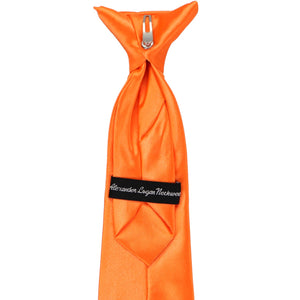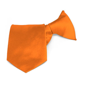 This boys' pumpkin orange clip-on tie is available in an 8-inch, 11-inch or 14-inch length to fit most boys up to 10-years old. The pre-tied clip simply attaches to the top of the boy's shirt, without any material around the neck. Matching adult sizes and styles available for purchase.