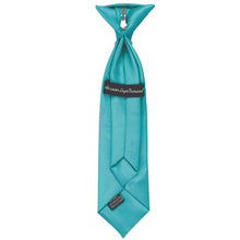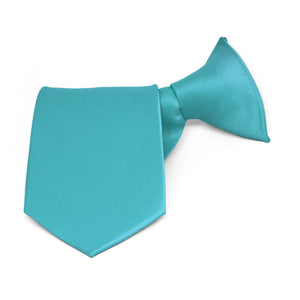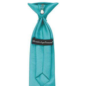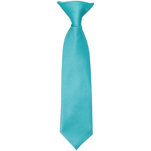 This boys' turquoise clip-on tie is easy to use and sized just right for your little guy. Available in an 8-inch, 11-inch or 14-inch length, these pre-tied ties are sized to fit most boys up to 10-years old. The clip on the tie simply attaches to the top of the boy's shirt, without any material around the neck. Made from durable, 100% polyester with a satin finish. Designed to match our signature collection of men's turquoise solid color neckties.