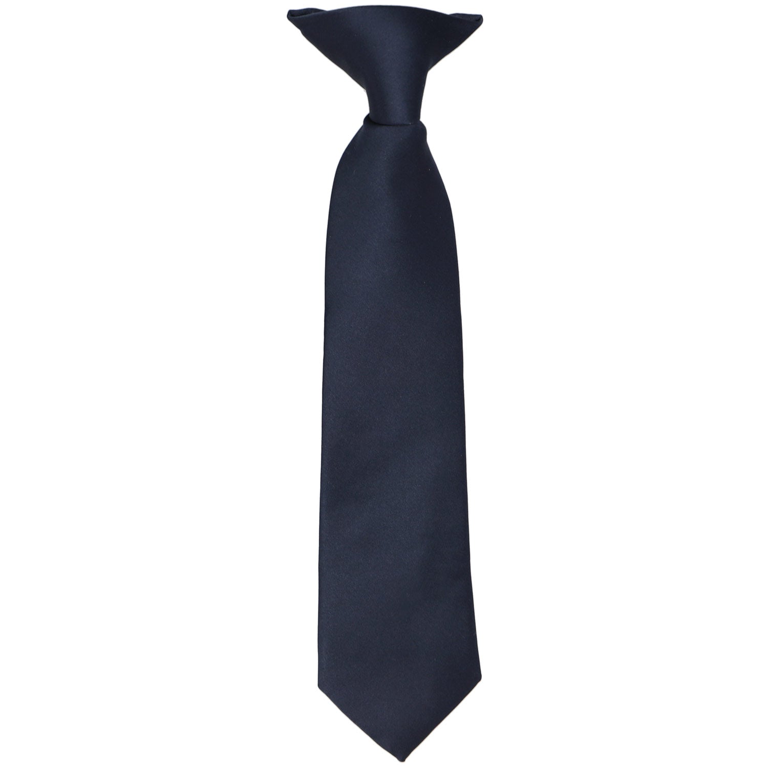 This boys' dark navy blue clip-on tie is easy to use and sized just right for your little guy. Available in an 8-inch, 11-inch or 14-inch length, these pre-tied ties are sized to fit most boys up to 10-years old. The clip on the tie simply attaches to the top of the boy's shirt, without any material around the neck. This boys' clip-on tie is designed to match our collection of men's dark navy blue solid color neckties.