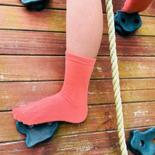 These coral socks come in three sizes to fit toddlers, boys and big kids up to about 10 years old, on average. We generally recommend a size small for ages 1 to 3 years, medium for ages 3 to 7 years and large for ages 7 to 10 years. Specific shoe sizes are shown below. (For pre-teens and older, check these socks out in our men's size.)