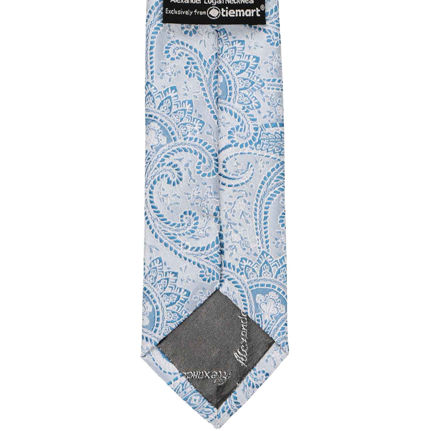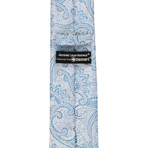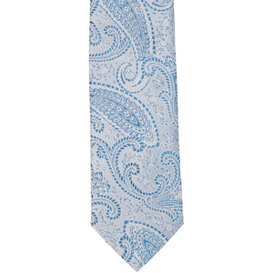 Front of a boys pastel blue paisley tie