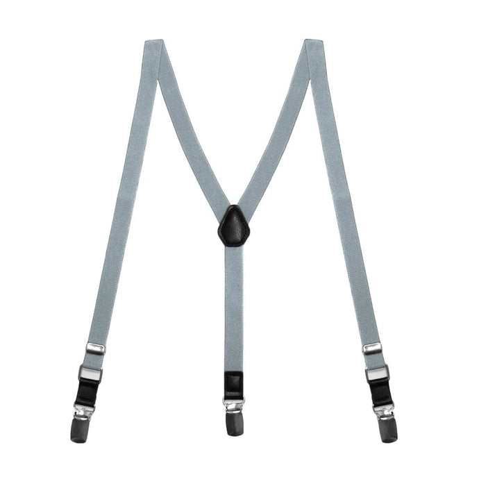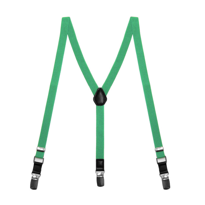 A pair of children's black suspenders with shiny metallic details, laid out into an M shape