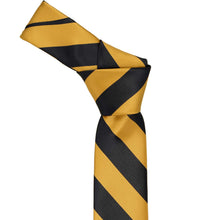 This popular black and gold bar striped boys' necktie ensures he stands out brilliantly for any event. Its striking appearance, featuring 0.75-inch wide collegiate stripes, is a go-to choice for school teams and dress codes. When he masters the skill of tying this necktie on his own, he gains immediate maturity and can display his colors with unmistakable, self-earned style.
