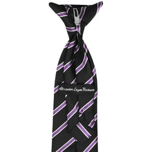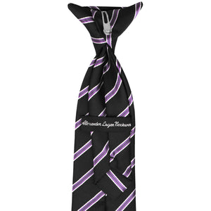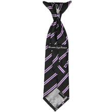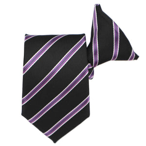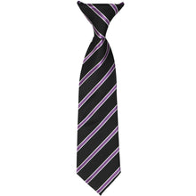 He'll stand out on picture day with this stylish boys' clip-on tie! The classic black background and bold purple pencil stripes create a sleek, polished look that’s just as versatile as a solid color tie. Whether he's dressing up on his own or coordinating with Dad for a matching father-son outfit, this tie pairs effortlessly with black slacks or a suit. Perfect for school photos, special occasions, or anytime he wants to look his best!