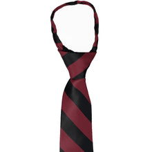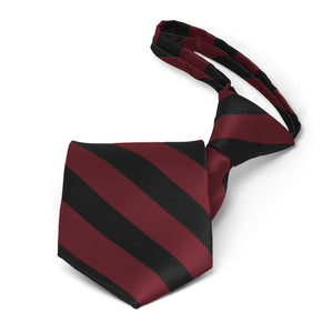 Perfect for school uniforms! This pre-tied burgundy and black striped tie is sized to fit most boys 6 to 10 years old. (For the best fit, measure the child from the top of the collar to the waist.) The kid-friendly tie is easy to use and looks just like a standard necktie when worn. The secret is a zipper in the tie tail that allows the collar to quickly expand and fit over the head without having to tie a knot. Larger sizes for men and teens available for purchase.