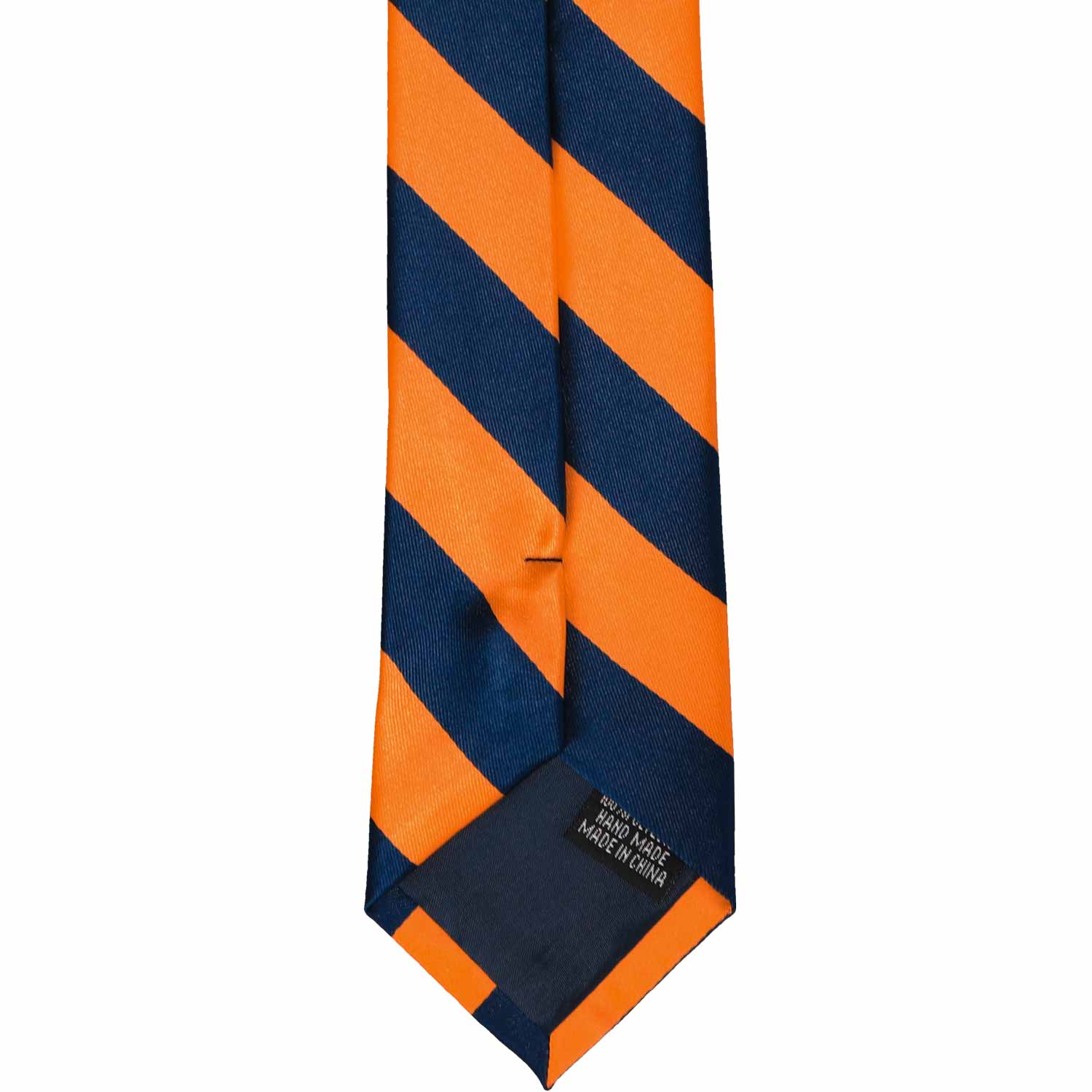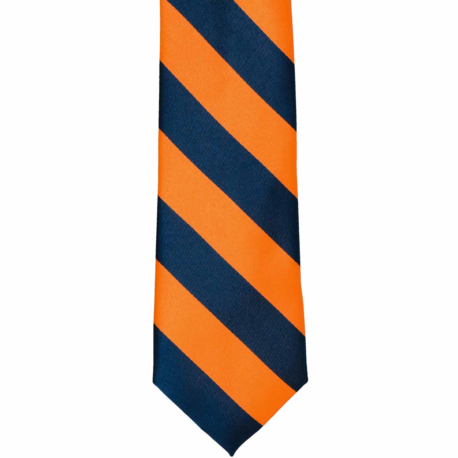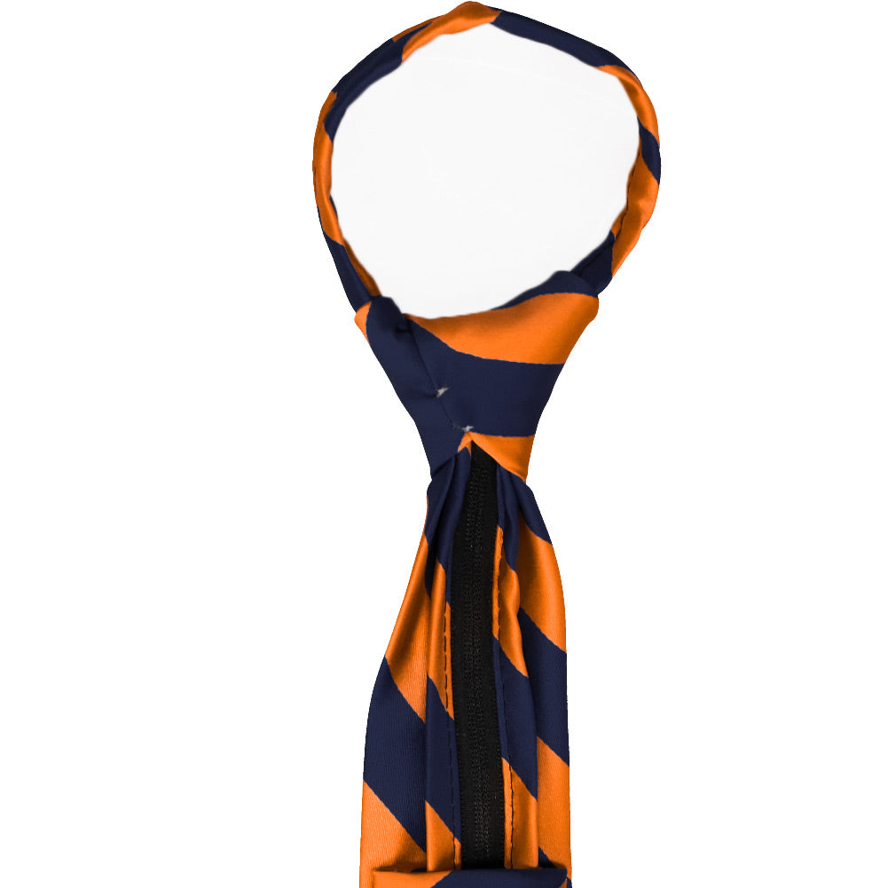 Perfect for school uniforms! This pre-tied navy blue and orange striped tie is sized to fit most boys 6 to 10-years old. (For the best fit, measure the child from the top of the collar to the waist.) The kid-friendly tie is easy to use and looks just like a standard necktie when worn. The secret is a zipper in the tie tail that allows the collar to quickly expand and fit over the head without having to tie a knot. Larger sizes for men and teens available for purchase.