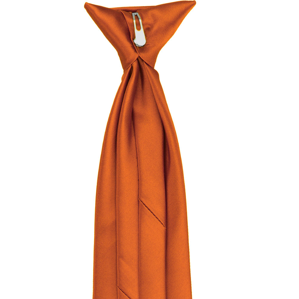 A burnt orange clip-on tie, folded to show off the clip and tie tip