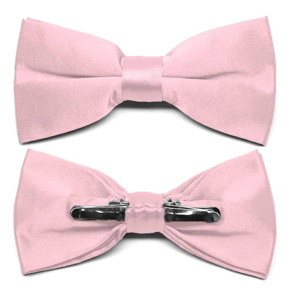 Wear a perfect bow every time with this carnation pink clip-on bow tie. This pre-tied bow features a heavyweight clip that discretely attaches to either side of your shirt collar material for a secure fit. One size fits all, regardless of neck size. Has a shiny, satin look. Matching pocket squares available.