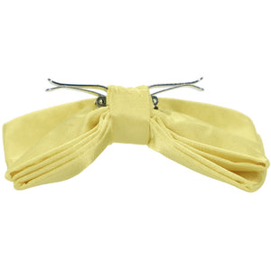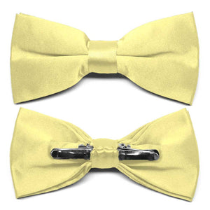 Wear a perfect bow every time with this butter yellow clip-on bow tie. This pre-tied bow features a heavyweight clip that discretely attaches to either side of your shirt collar material for a secure fit. One size fits all, regardless of neck size. Has a shiny, satin look. Matching pocket squares available.
