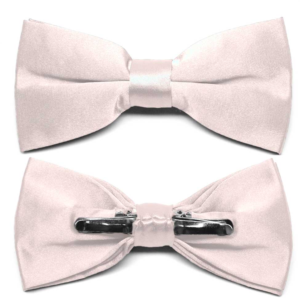 Wear a perfect bow every time with this tea rose pink clip-on bow tie. This pre-tied bow features a heavyweight clip that discretely attaches to either side of your shirt collar material for a secure fit. One size fits all, regardless of neck size. Has a shiny, satin look. Matching pocket squares available.