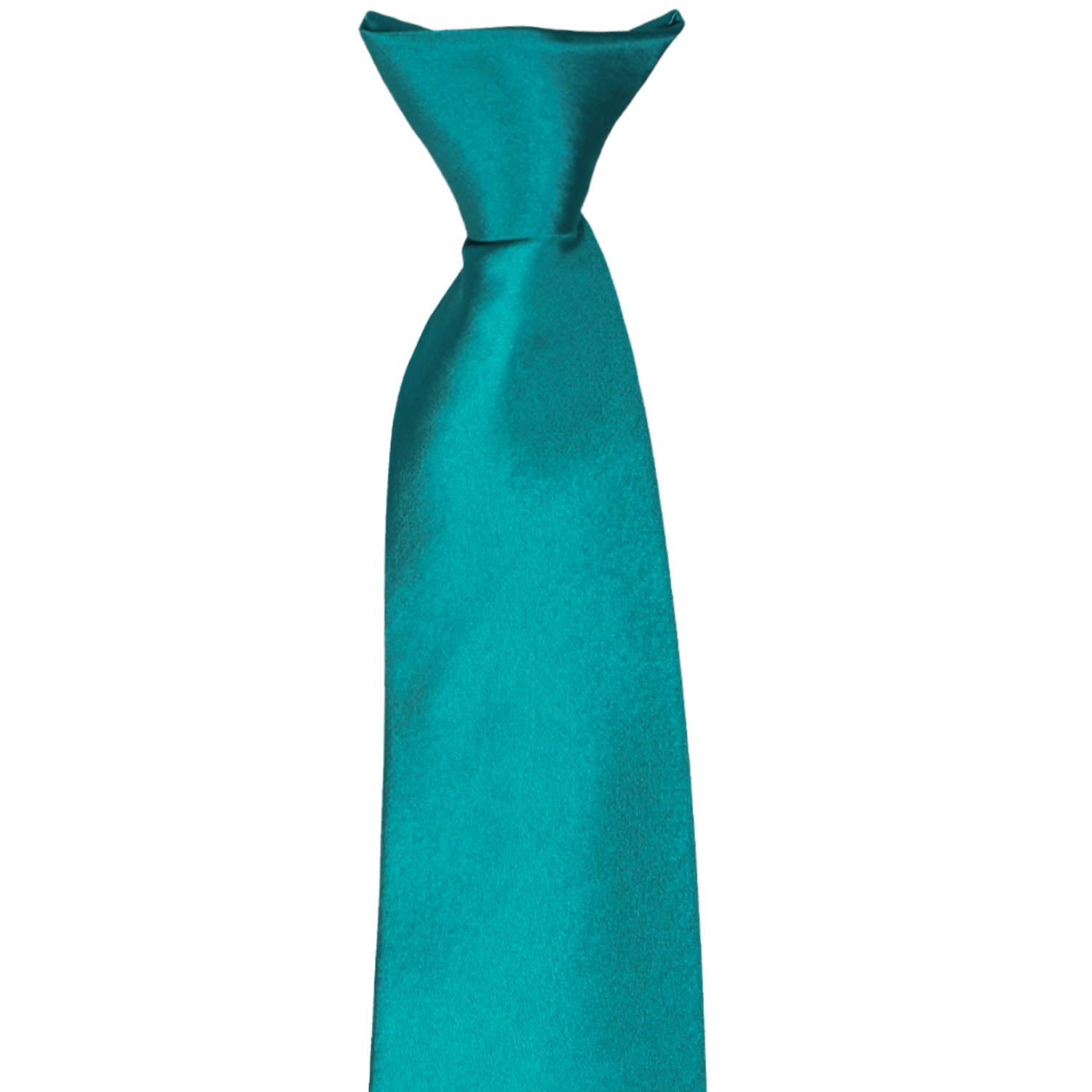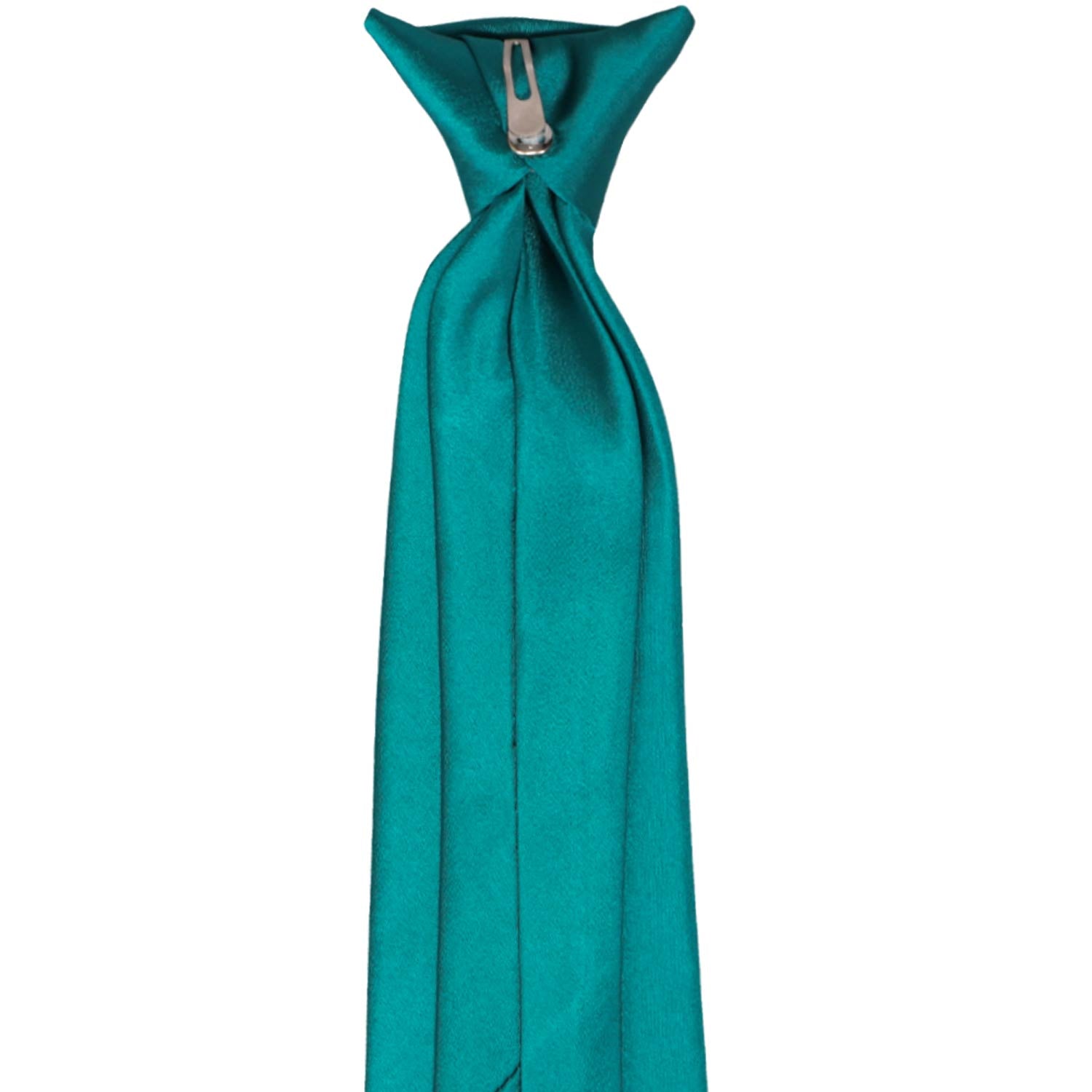 This deep aqua solid color clip-on tie features a pre-tied knot for easy use. It's made of durable, 100% polyester with a satin finish. Though sized for men, the 3.5-inch width is equally versatile for women and teens. Popular for individual use, but the pre-tied style makes it a favorite for large group or staff attire.