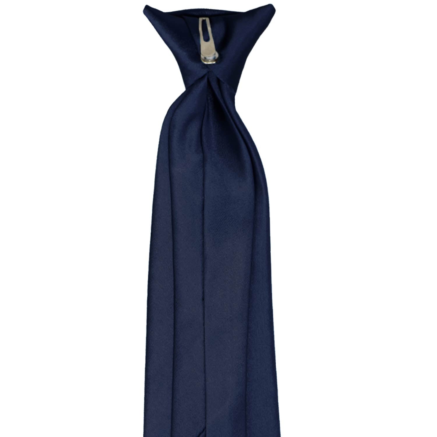 This twilight blue solid color clip-on tie features a pre-tied knot for easy use. It is made of durable, 100% polyester with a satin finish. Though sized for men, the 3.5-inch width is equally versatile for women and teens. Popular for individual use, but the pre-tied style makes it a favorite for large group or staff attire.