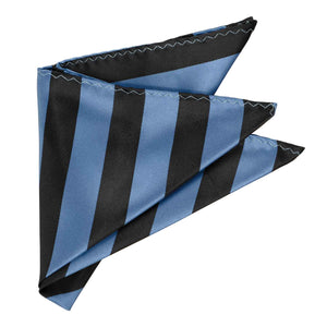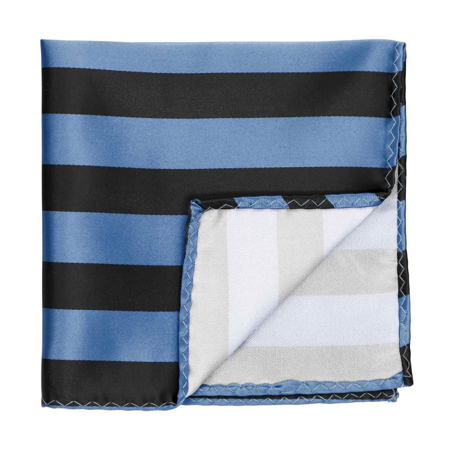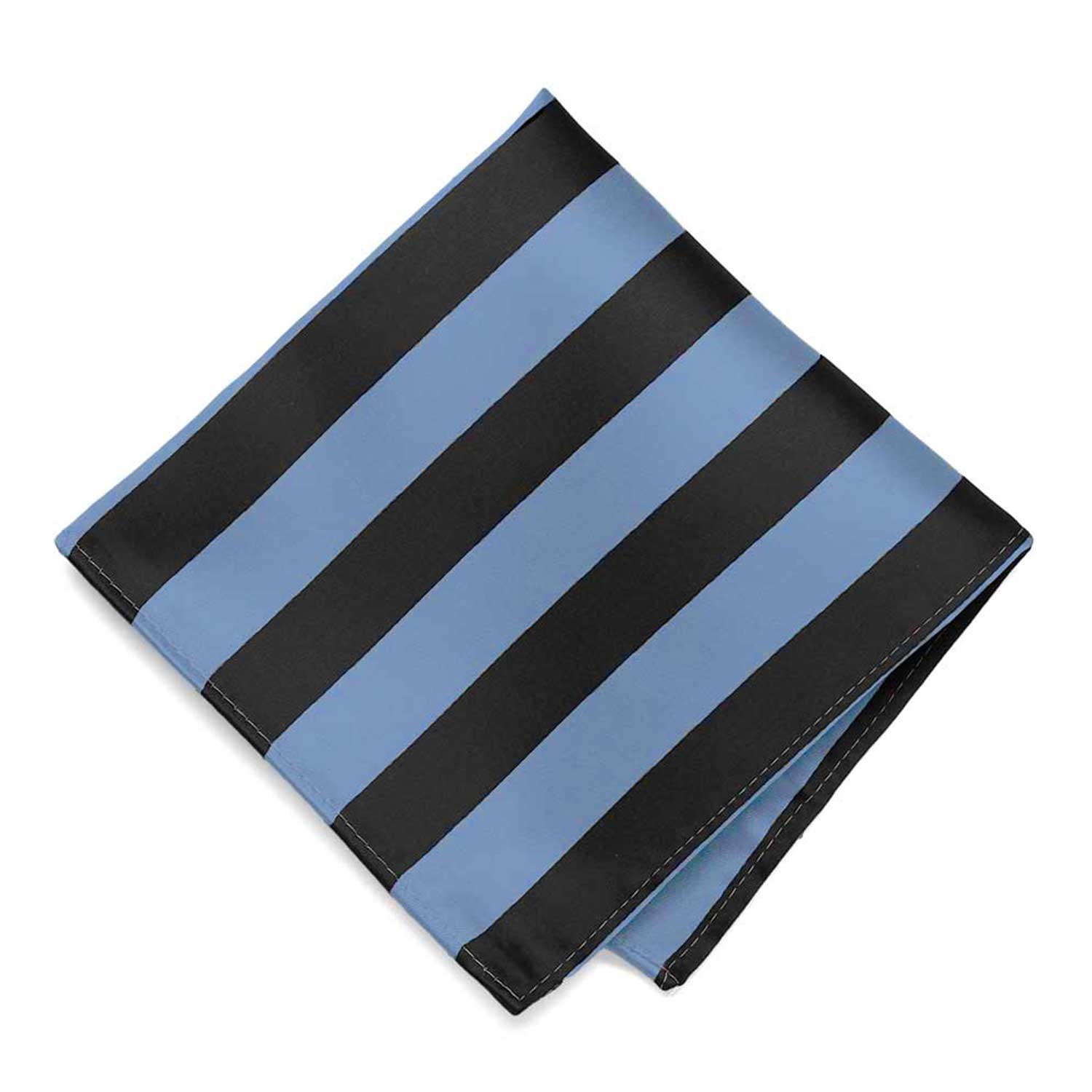 This cornflower and black striped pocket square measures a large, 12-inches by 12-inches to suit a wide variety of folds. The tightly woven material creates a smooth finish for a sharp look. Matching ties available for purchase.