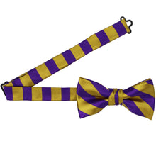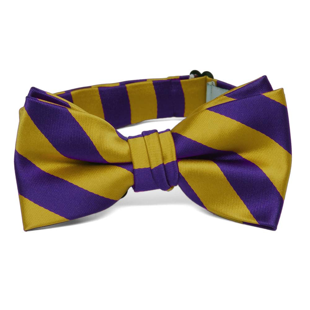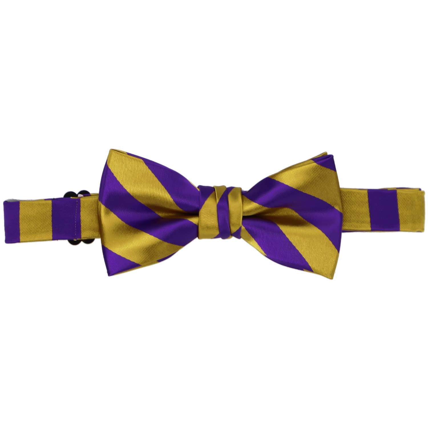 We designed this boys' dark purple and gold striped bow tie to coordinate with our popular men's striped accessories. At 0.5-inches, the stripes are slightly skinnier than the men's size to be more proportionate for a child. The bow is pre-tied with a band collar sized for most boys from baby to 10-years old.