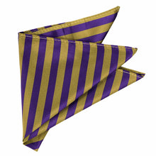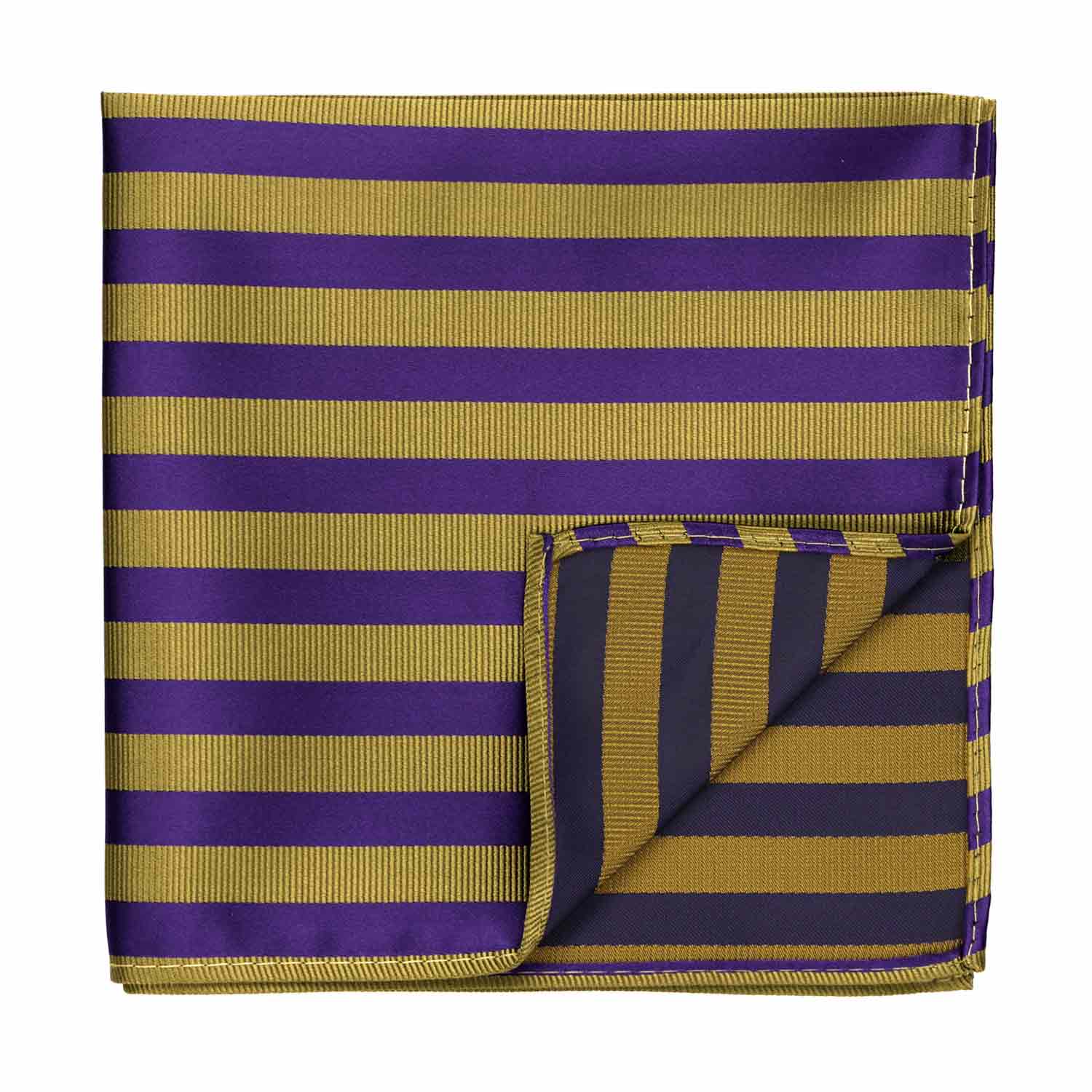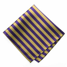 Sport this eye-catching dark purple and gold pocket square in your jacket for a smart way to show off your school or team's colors. The alternating stripes feature ribbed and satin finishes. Pair it with the matching tie or bow tie (available for purchase), or use it to contrast against a solid color tie.