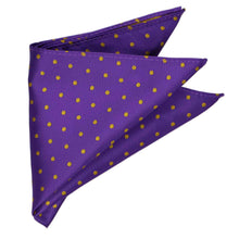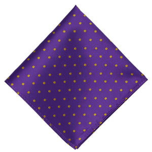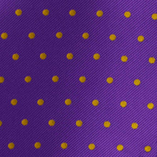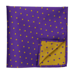 Check out this dark purple and gold polka dot pocket square. It's the perfect accessory for any occasion, whether you're heading to the office, showing support for your team or marching in a Mardi Gras parade. The polka dots are just the right size—not too small or big—for a playful touch. Don't forget to complete your look with the matching necktie or bow tie, sold separately.