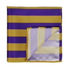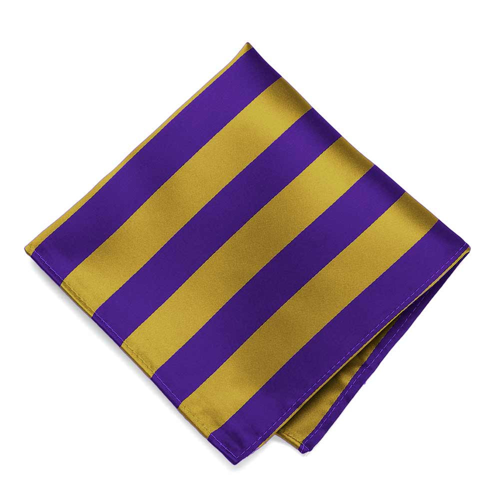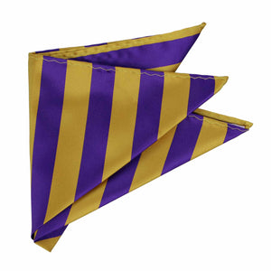 This dark purple and gold striped pocket square measures a large, 12-inches by 12-inches to suit a wide variety of folds. The tightly woven material creates a smooth finish for a sharp look. Matches our dark purple and gold striped ties and bow ties.