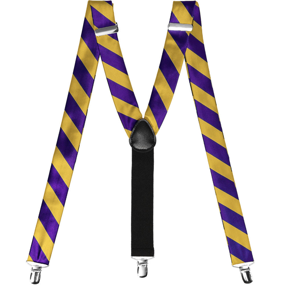 Whether you're showing your school spirit or rooting for your favorite team (in style), these dark purple and gold striped suspenders are a must. Made from the same material as our ties, the suspenders feature 1.25-inch wide straps with 0.75-inch wide stripes. They adjust from approximately 30.5 to 49-inches to fit most men, women and teens and hold securely in place with three silver-tone clips. Y-back design with a black crosspatch. Looks great with the matching bow tie and socks!