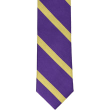 From lunch in the French Quarter to a modern school uniform, there are so many places to wear this purple and gold striped tie. The width is updated in a narrow, 3-inch size, which is about 0.25- to 0.5-inches skinnier than a standard tie today. It’s not too skinny, but still trendier than a regular width. The stripes combine two different textures—woven ribbing and a smooth, soft finish—for an eye-pleasing look.
