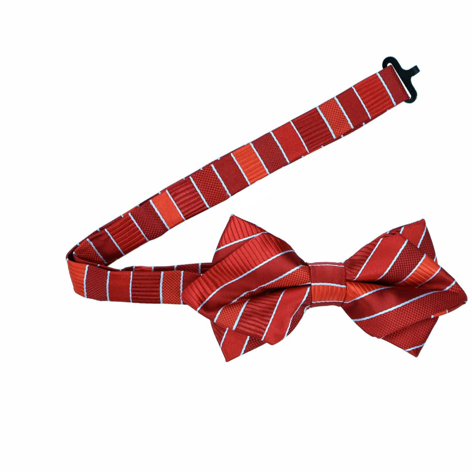 Make a statement with a detailed red striped diamond tip bow tie, designed with in a pre-tied style for effortless wear. Red adds confidence and bold sophistication, making it the ideal choice for important business meetings or occasions where you want to stand out. The timeless striped pattern pairs seamlessly with any suit color, offering versatility and style. Complete your formal look with a matching pocket square, ensuring a polished and coordinated appearance.