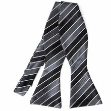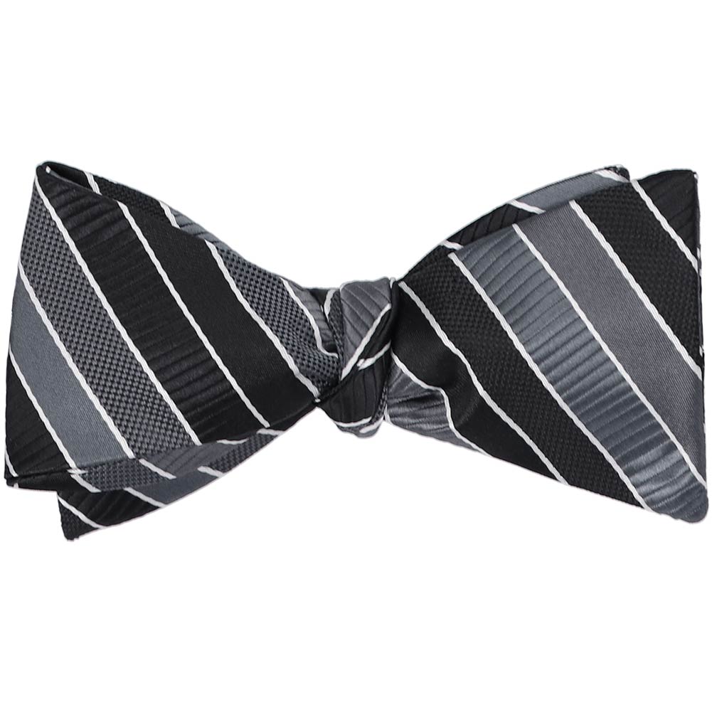 Set off your look with this black, dark gray, and white striped self-tie bow tie. Its neutral color palette exudes sophistication and versatility, making it a go-to accessory for both formal and casual occasions. The timeless striped design seamlessly complements office wear, evening attire, or somber events, ensuring a polished and refined appearance. Whether paired with a sharp suit or dressed down with a crisp shirt and slacks, this self-tie bow tie offers a classic yet modern touch, perfect for those who appreciate effortless style with a hint of distinction.