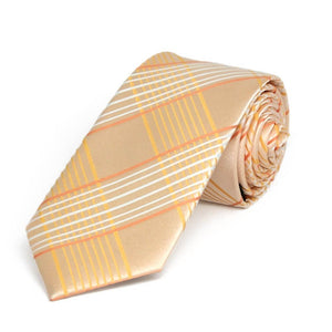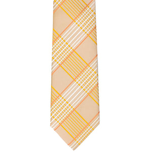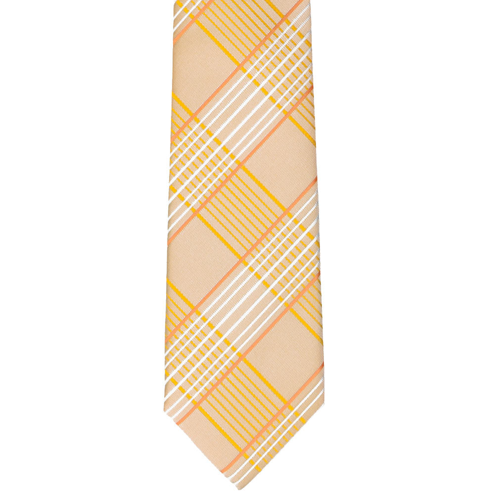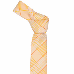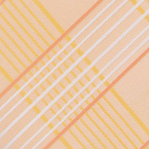 Sunny days are here, and it’s time to bring in those light and breezy vibes! This slim light orange plaid tie is just the pop of color your wardrobe needs. The large plaid pattern is bold yet perfectly balanced, with subtle touches of yellow and white that make it ideal for Easter brunch, a summer wedding, or even your barefoot beach ceremony. Pair it with a crisp white shirt, tan slacks, and suspenders for a relaxed vibe, or go office casual with khakis. Want to dress it up? A navy blue suit seals the deal. The styling possibilities are endless!