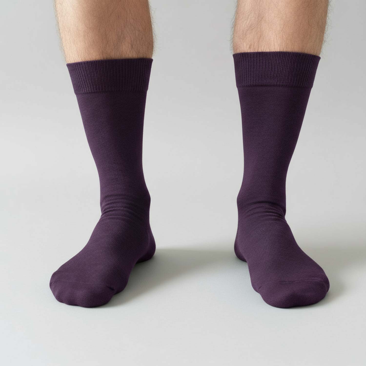 These men's eggplant purple dress socks are a dark plum shade. They are one of our most popular colors for groomsmen socks, but are a great addition to any man's business attire. This color looks so good with a gray suit!