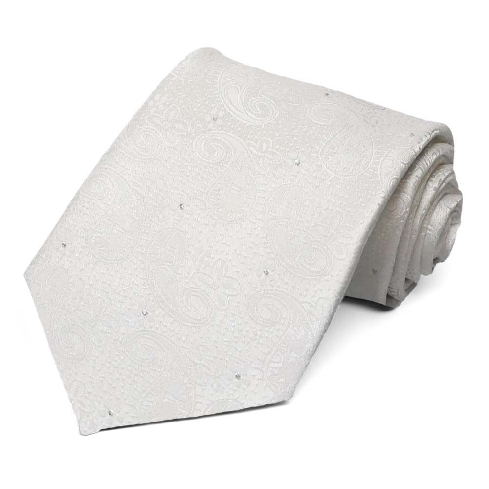 A delicate paisley design pops from the background of this extra long white tie. Woven strands of Lurex thread give it a shimmery appearance, just right for a special occasion. Easy to match to your Prom date or your wedding colors.