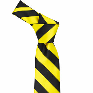 One of our most popular striped tie combos, now in an extra long length for big and/or tall men. This yellow and black striped tie features a 63-inch length, 6-inches longer than our standard-sized ties. Made from 100% polyester microfiber. Also available in a standard-sized tie, bow tie, skinny tie, pocket square and boys' size.