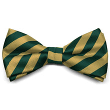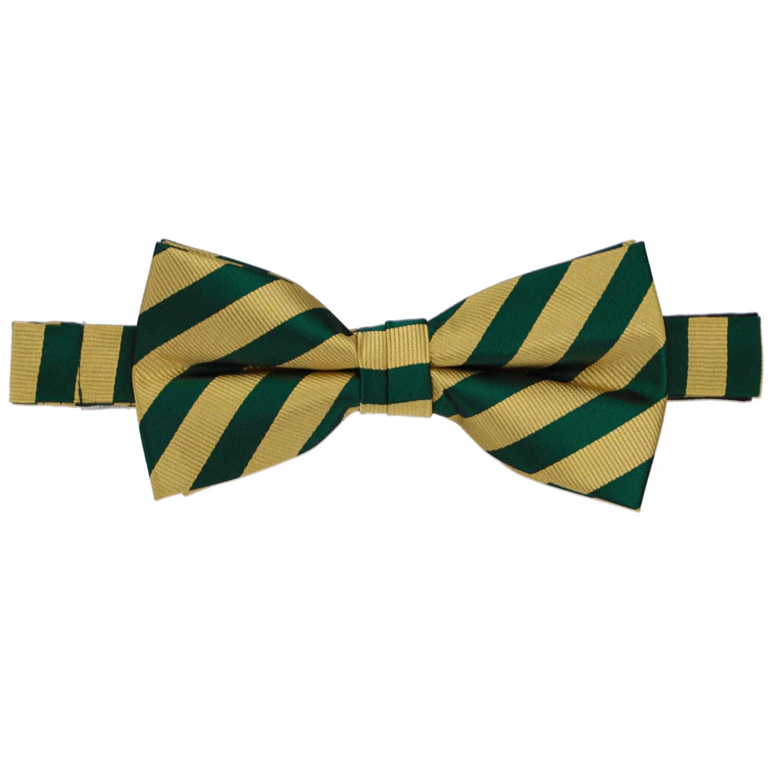 Heading to your high school graduation or reunion? Sport this hunter green and gold bow tie to show off your school spirit. The alternating satin and ribbed stripes give this bow tie a textured look. Looks sharp alone with a button down shirt and slacks, or added to a black suit for formal occasions. Don't forget to purchase the matching pocket square for that finishing touch on your formal attire.