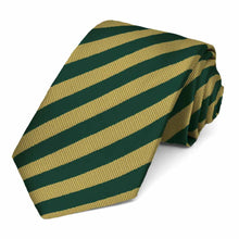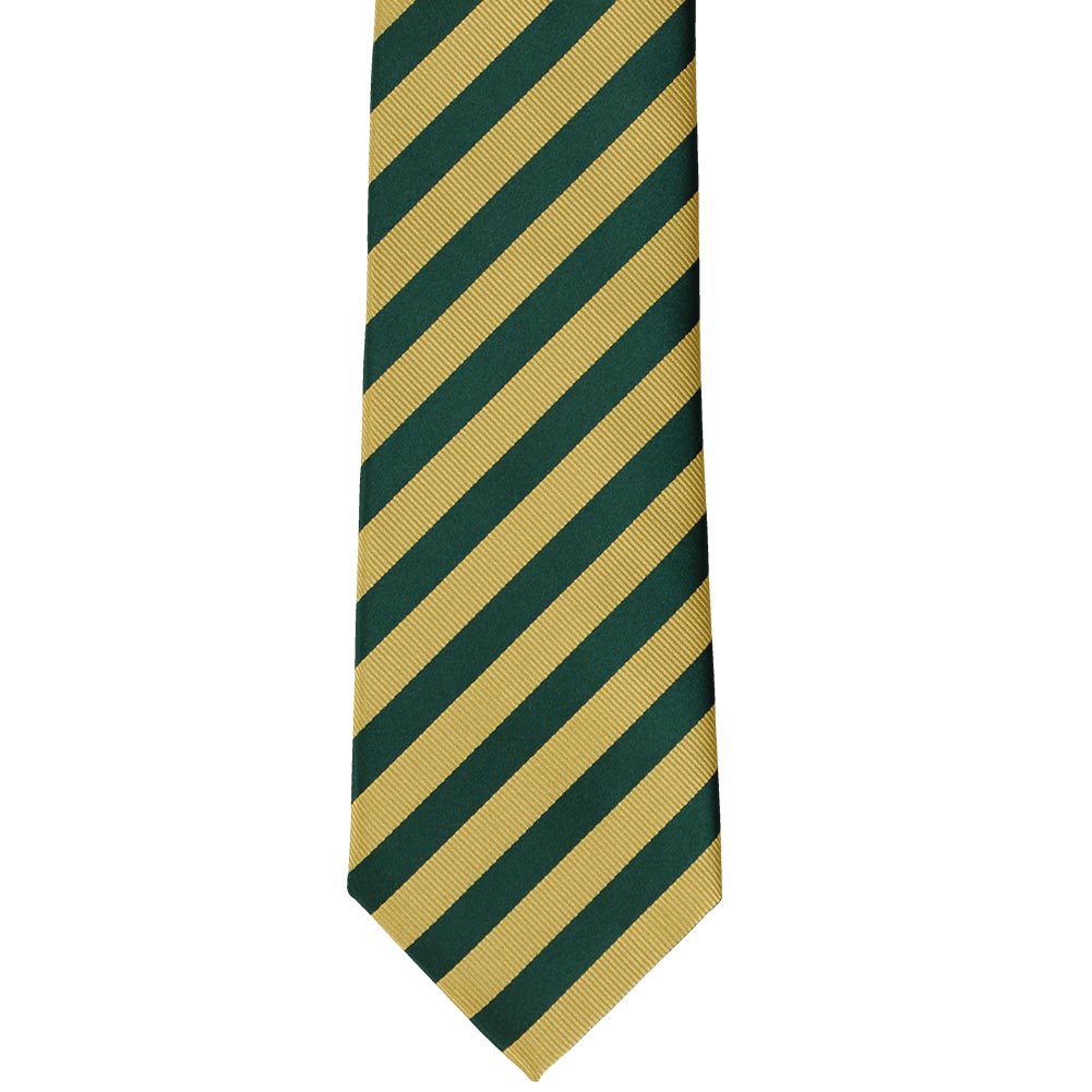 This hunter green and gold striped tie is a sophisticated way to show off school and sports team colors. Crafted from satin and ribbed stripes, the alternating color pattern will complement your best suit or a more casual button down and slacks combo. When you're dressing it up, add the matching pocket square (sold separately).